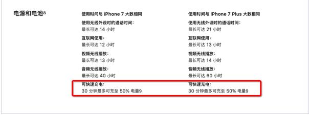 蘋果并沒有在發(fā)布會上提及新款iPhone支持快充,當(dāng)然還是有眼尖的網(wǎng)友在官方頁面注意到蘋果的描述:可快速充電:30分鐘最多可充至50%電量。