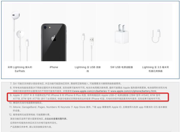 蘋果還是這么高冷,盡管之前備受吐槽沒有快充功能,這一次有了快充,居然也絲毫不提,實際上,從最后的注釋中可以發(fā)現(xiàn),盡管具備了快充功能,但隨機附送的充電器卻不支持快充,仍舊是祖?zhèn)?W充電器。在備注中,用于測試快充功能的充電器為29W的A1540、61W的A1718,87W的A1719,均為iPad Pro、13寸和15寸Macbook Pro的電源適配器,因此,想要快速充電的話,你還需要單獨購買一個充電器,此外,iPhone 8/8 Plus和iPhone X均兼容USB-PD充電協(xié)議,因此,市面上還有很多第三方的支持USB-PD的充電器也可以實現(xiàn)快速充電。