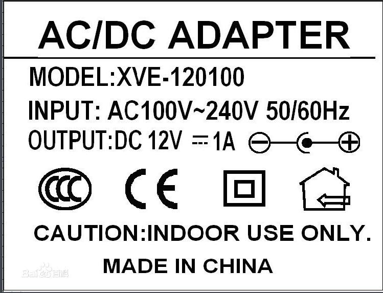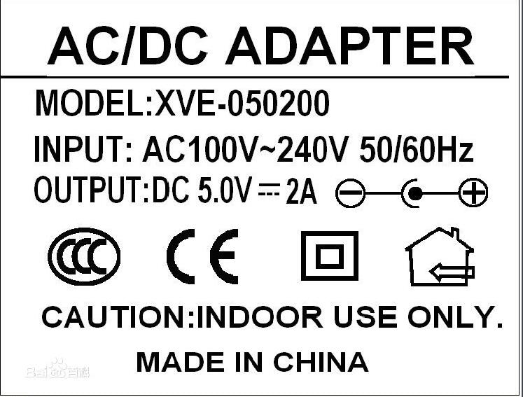如圖所示,在電源適配器(下面稱adapter)的標(biāo)簽上面一般會有幾項(xiàng)是需要注意的。第一,是adapter的型號,例如這顆adapter的型號是XVE-120100,它告訴了我們幾個(gè)信息,就是它的廠商、主要參數(shù)等,XVE開頭的一般就是##公司代號,120100就是說明這個(gè)adapter是12W的,050200的就是10W的;第二就是adapter的INPUT(輸入),在中國通用的一般是100-240V~50-60Hz,這說明這個(gè)adapter可以在100V-240V的電壓下面正常工作;第三就是adapter的OUTPUT(輸出),兩個(gè)數(shù)字可以很快速的算出這個(gè)adapter的瓦數(shù),例如這個(gè)adapter,電壓12V*電流1A=12W(功率),說明這個(gè)電源就是12W的adapter。