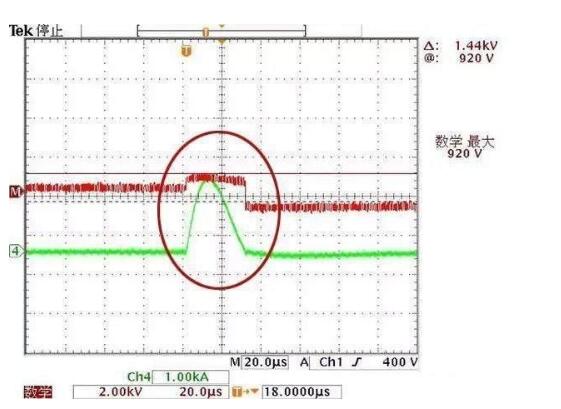 在電涌沖擊一瞬間,因?yàn)橛锌闺娪勘Wo(hù),所以電壓只是有略微的起伏,但仍然保持在平穩(wěn)范圍,保障了設(shè)備安全。、