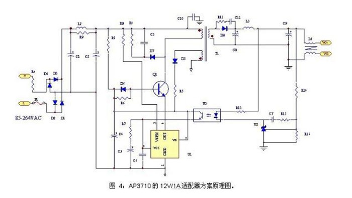 圖4是AP3710的適配器方案原理圖。AP3710(U1)的脈沖輸出腳與三極管Q1的發(fā)射極直接相連,電網上電后,U1的OUT腳首先從Q1的發(fā)射極獲得能量,實現啟動。C6、R7和C5是環(huán)路補償元件,再配合恒壓元件U2實現對負載端電壓的穩(wěn)定性調節(jié)。整體方案具有最好的性能,諸如待機功率、 EMI、轉換效率、動態(tài)特性等性能達到了高性能電源適配器的指標要求。另外,該方案的器件數量少,沒有輸入X電容及共模電感,Q1是低價格的晶體三極管,因而這是一種極高性價比的電源適配器方案。