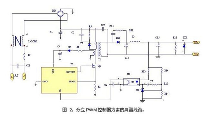 無論是圖1的集成PWM控制方式還是圖2的分立PWM控制器,都只能與功率器件MOSFET配套使用,故成本較高;為了符合電磁兼容要求,其應用系統(tǒng)的輸入部分還必須含有X電容和共模電感L-COM組成的輸入濾波電路,成本也高。粗略估算,PWM控制(包括功率MOSFET)及輸入濾波電路的成本是整個系統(tǒng)元件成本的35%,這些都不符合消費類電子低成本的趨勢要求。