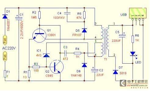 圖中用1歐的電阻F1起到保險絲的作用,用一個二極管D1完成整流作用。接通電源后,C1會有300V左右的直流電壓,通過R2給Q1的基極提供電流,Q1的發(fā)射極有R1電流檢測電阻R1,Q1基極得電后,會經(jīng)過T1的(3、4)產(chǎn)生集電極電流,并同時在T1的(5、6)(1、2)上產(chǎn)生感應(yīng)電壓,這兩個次級絕緣的圈數(shù)相同的線圈,其中T1(1、2)輸出由D7整流、C5濾波后通過USB座給負(fù)載供電;其中T1(5、6)經(jīng)D6整流、C2濾波后通過 IC1(實為4.3V穩(wěn)壓管)、Q2組成取樣比較電路,檢測輸出電壓高低;其中T1(5、6)、C3、R4還組成Q1三極管的正反饋電路,讓Q1工作在高頻振蕩,不停的給T1(3、4)開關(guān)供電。當(dāng)負(fù)載變輕或者電源電壓變高等任何原因?qū)е螺敵鲭妷荷邥r,T1(5、6)、IC1取樣比較導(dǎo)致Q2導(dǎo)通,Q1 基極電流減小,集電極電流減小,負(fù)載能力變小,從而導(dǎo)致輸出電壓降低;當(dāng)輸出電壓降低后,Q2取樣后又會截止,Q1的負(fù)載能力變強(qiáng),輸出電壓又會升高;這樣起到自動穩(wěn)壓作用。