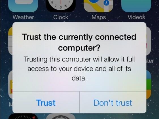 如圖所示,在新版iOS 7中當(dāng)你連接數(shù)據(jù)線之后你還需要手工進(jìn)行點(diǎn)擊來確保設(shè)備所連接的充電器是否是可信的,如果你在連接到充電器之后跳出這個(gè)信息,你可能需要考慮使用新的充電插頭了。