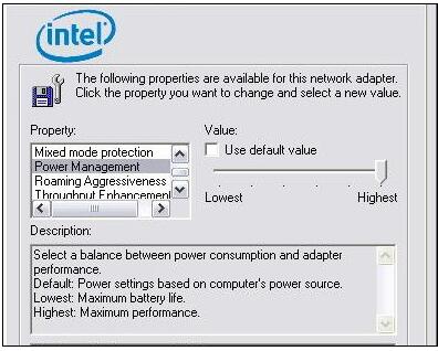 遠(yuǎn)程工作人員為了盡可能的保持電池電量,總是傾向于在有電源插座的情況下就使用電源適配器。如果你不認(rèn)同我的觀點(diǎn)的話,就試著在機(jī)場找一個(gè)開放的電源插座看看難度有多大。遠(yuǎn)程工作人員都知道,對顯示屏和硬盤驅(qū)動(dòng)器進(jìn)行定時(shí)設(shè)置可以節(jié)省電力。但無線網(wǎng)絡(luò)適配器的省電功能卻并不廣為人知。